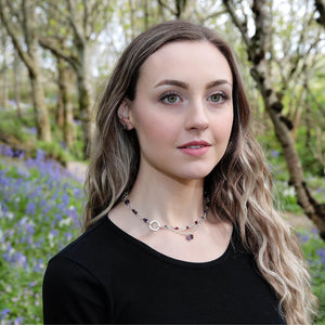 Designed by Orcadian artisan Teresa Shearer, these exquisite stud earrings showcase the deep, rich tones of purple amethyst and red garnet, beautifully paired with a hammered silver heart.