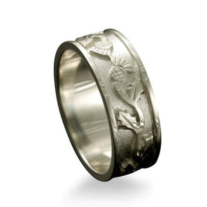 A stunning ring handcrafted from sterling silver, white or yellow gold by Shetland Jewellery, featuring an intricate design inspired by Scotland's iconic national flower, the thistle. This elegant piece captures the wild beauty and proud heritage of the Scottish landscape, making it a meaningful choice for those who cherish Celtic traditions or Scottish roots. Whether worn as a personal symbol of strength and resilience or gifted to someone special, this versatile ring complements any style. Available in your choice of precious metals, it's a timeless investment piece that celebrates Scotland's natural beauty with authentic craftsmanship and enduring appeal.