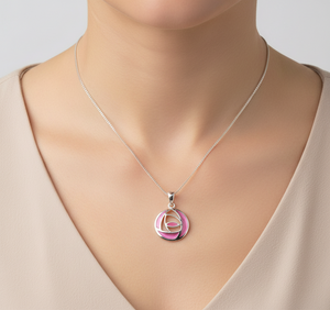A captivating pendant handcrafted by Sea Gems in Cornwall, England. The pendant is made from sterling silver and beautiful handpainted enamel in a stylised rose design, inspired by Charles Rennie Mackintosh's window designs. Each Sea Gems piece comes in it's own presentation box.