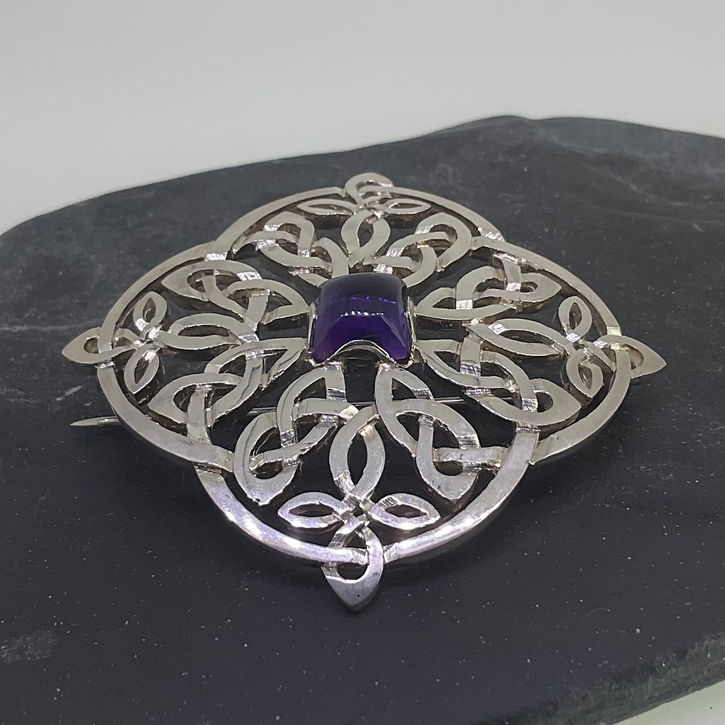 A spectacular Celtic brooch, with a timeless design that entails an eye-catching Celtic style. This fantastic piece is hand made from sterling silver and is crafted in Glasgow, Scotland by Mithril Jewellery.
