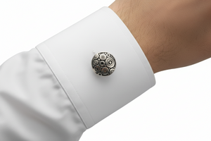 An attractive and elaborately detailed pair of sterling silver cufflinks, decorated with a fascinating design and a hinged back for easy fastening.