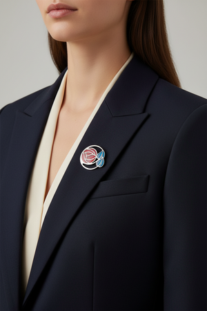 This is a stunning brooch, made from rhodium plated copper and enamel and handmade in Cornwall, England. This brooch has an intricate rose design inspired by the window designs of Charles Rennie Mackintosh. The roses are finished with pink enamel and the background of the brooch is in purple enamel.