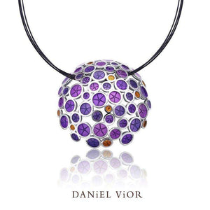 This exquisite necklace is hand made by the Spanish designer Daniel Vior using sterling silver with beautiful violet enamel, the colour just leaps off the jewellery and makes it stand out.