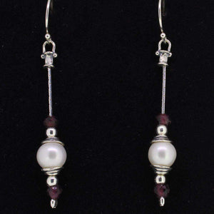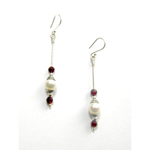 Gorgeous sterling silver dangly earrings, set with cultured freshwater pearls and small garnets. These earrings are so pretty and also have a matching designer jewellery necklace available to purchase in the collection.