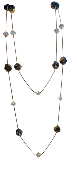 A stunning long gold coloured beaded chain from our fashion jewellery section .Affordable and stunning on top of a dress or sweater. Made with freshwater pearls and cut glass