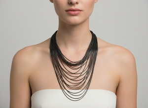 A stunning long oxidised silver coloured multi chain from our fashion jewellery section .Affordable and stunning on top of a dress or sweater.