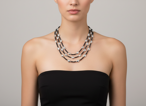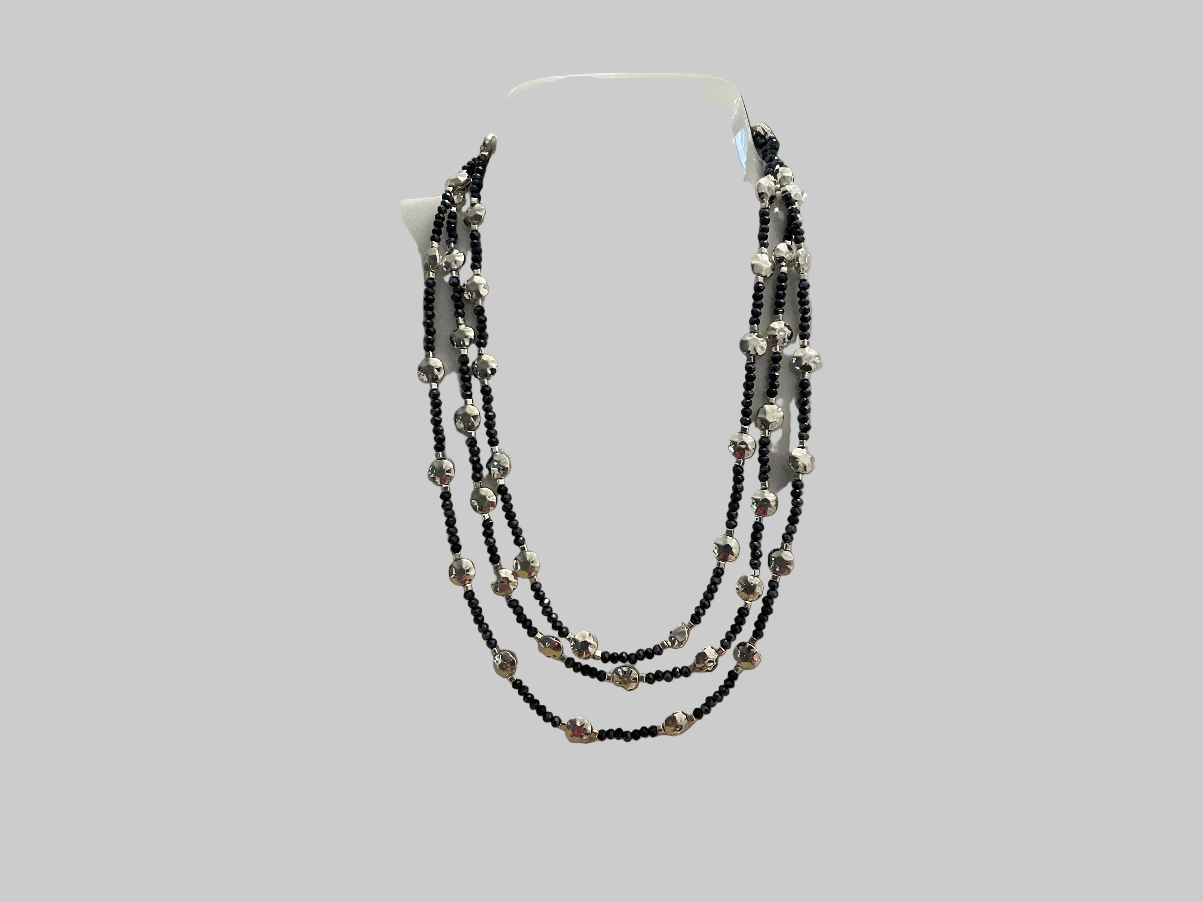 A stylish short 3strand silver coloured beads set with black sparkly stones , from our fashion jewellery section. Affordable and stunning on top of a dress or sweater.
