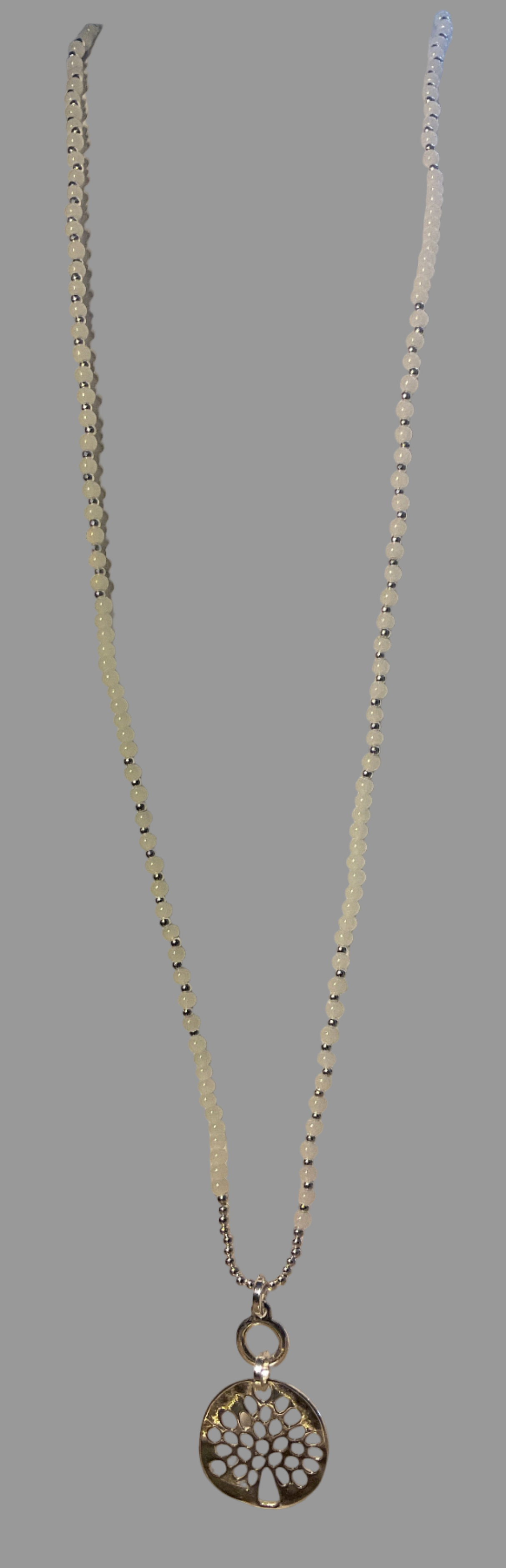 A captivating silver coloured necklace from our fashion jewellery collection. The necklace has a white/grey and silver coloured beads and a silver coloured abstract tree of life set with a T Bar hanging from the chains.