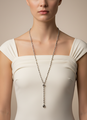 A stunning long fine silver coloured chain set with crystals from our fashion jewellery section .Affordable and stunning on top of a dress or sweater. Dress this up or down it will look terrific.