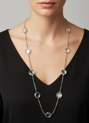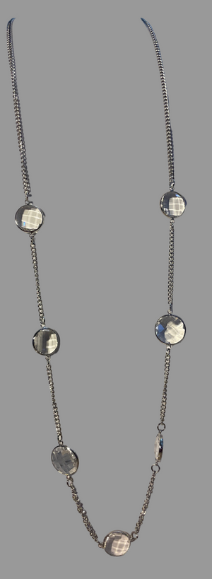 • A stunning long fine silver coloured  chain set with faceted crystals  from our fashion jewellery section .Affordable and stunning on top of a dress or sweater.