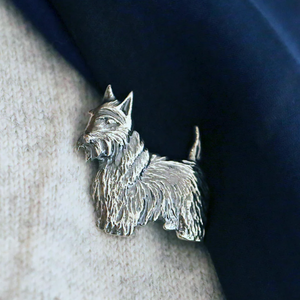 A beautiful Scottie dog brooch , handcrafted by Sheila Fleet in Orkney, Scotland. Each brooch is shaped into an iconic Scottie dog, in sterling silver..