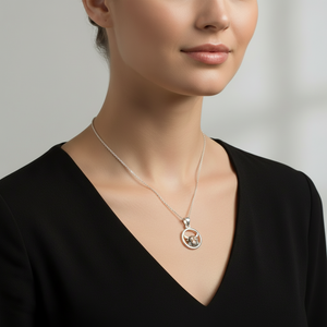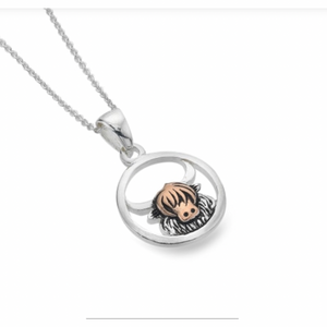Inspired by the Scottish highlands, this design makes the perfect gift for every animal lover. Featuring a Rose Gold plated highland cow within the centre of a circular, Sterling Silver design. This unique pendant is the perfect accessory for everyday wear. Can be worn with matching items in the collection Material: 18k Rose Gold Plate on 925 Sterling Silver Dimensions: 17 mm Height x 15 mm Width