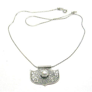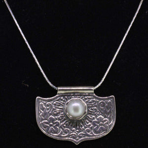 Beautiful textured freashwater pearl pendant crafted in sterling silver on an 18 inch snake chain.
