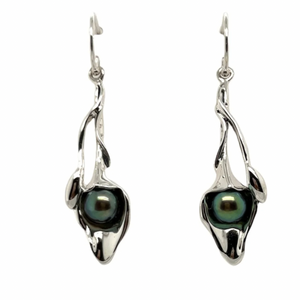 Exquisite designer drop earrings crafted in sterling silver has a contemporary design and set with a cultured pearl and a leaf design These stunning earrings feature a modern design, combining sterling silver with a beautifully cultured pearl and a leaf motif. A perfect addition to any jewelry collection..
