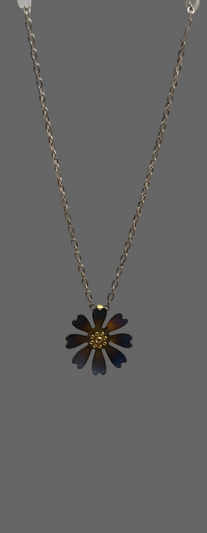 Gorgeous little pendant with fabulous colours shot through the titanium. Crafted with elegance and style in mind, this little flower pendant showcases the stunning beauty of titanium. With its vibrant colors and luxurious shine, it's a must-have accessory for any fashion-forward woman. Set on an18 inch silver chain.
