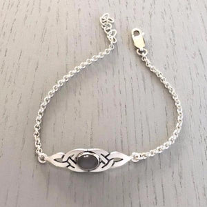 This beautiful bracelet is crafted in Orkney by Celina Rupp Jewellery. The inspiration for this collection came from the historic Celtic influences that can be found around Orkney. This particular piece is set with a beautiful stone at its heart, with a choice of Amber, Amethyst, Black Moonstone, Black Onyx, Garnet or Moonstone.
