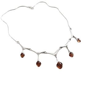 A beautiful and striking necklace featuring drops of rich cognac-colored amber.