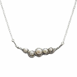 Elevate your style with our Silver and Pearl Necklace. The lovely line of various sizes of pearls creates a delicate and dainty look that can be dressed up or down. Add a touch of sophistication to any outfit. Set on an 18 inch chain.