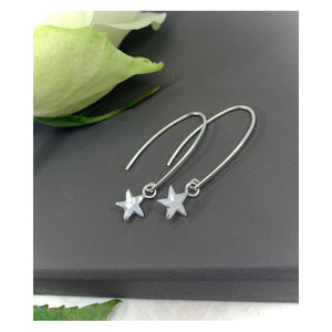 A lovely pair of sterling silver star drop earrings, made in Kinross in Scotland by Rebecca Jewellery. These earrings have a large hook fitting attacked to beautifully crafted stars.