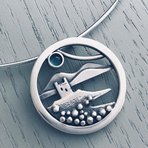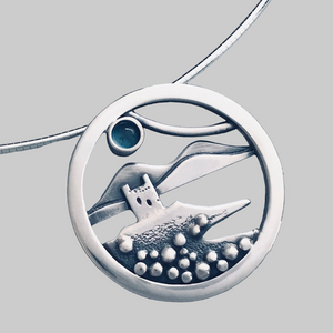 This beautiful necklace is crafted in Orkney by Celina Rupp Jewellery. The inspiration for this piece came from the many ruins of castles and stately homes that dot Scotland's landscape. Crafted from sterling silver, this necklet is shaped into a castle scene with a small London blue topaz in the sky.