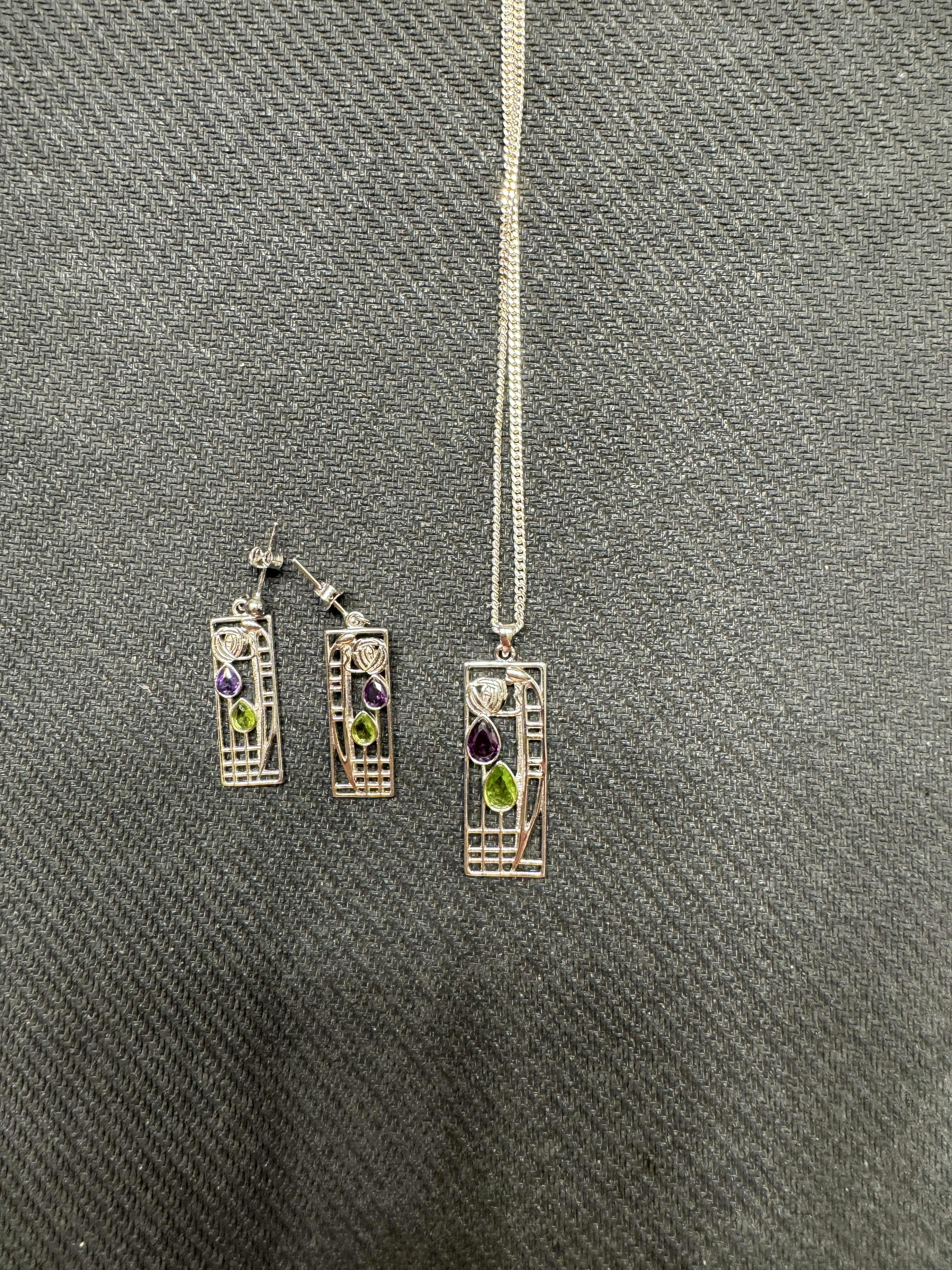 A stunning sterling silver pendant with a very stylish design inspired by Charles Rennie Mackintosh featuring beautiful peridot and amethyst created gemstones Experience the luxurious and elegant design of this timeless pendant, inspired by the renowned artist Charles Rennie Mackintosh. Adorned with gorgeous peridot and amethyst created gemstones, this pendant exudes a sense of sophistication and will surely make a statement. Elevate your style and add a touch of glamour to any outfit with this stunning piece..