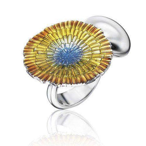 A phenomenal silver and enamel ring from Daniel Vior's Basia collection. This excellent piece is hand-made from rhodium plated sterling silver and the enamel work is hand-painted and the colours are delightful.