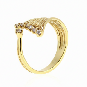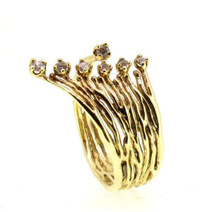 • This striking 14ct yellow gold and diamond designer ring has a captivating organic design.set with seven beautiful diamonds.