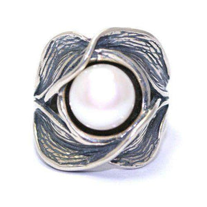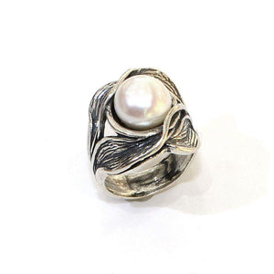 A captivating, hand crafted, sterling silver and cultured freshwater pearl ring, with a uniquely appealing design.