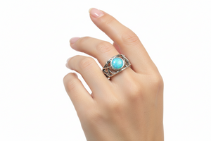 This eye catching ring is made by the designer Tamir Zuman and handcrafted using textured and highly polished sterling silver. The ring features a large irridescant opaline stone with wirework that almost looks Celtic in design.