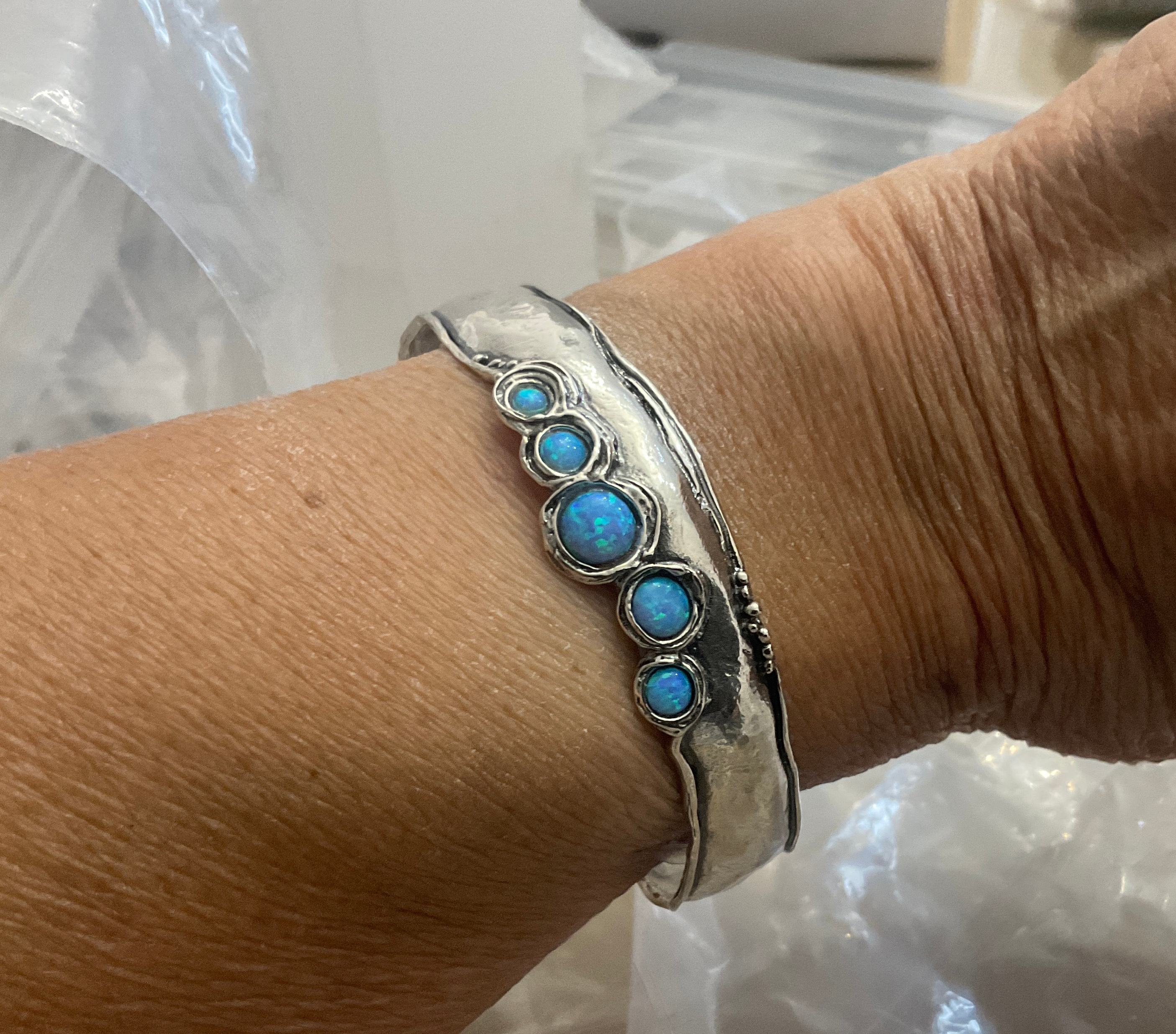 Astonishingly attractive designer bangle hand crafted from sterling silver set with Opalines intricately crafted organic work. Expertly designed to showcase your unique style. This stunning bangle is handcrafted from high-quality sterling silver and features intricate organic work, accented by dazzling Opalines. Elevate any outfit with this must-have accessory.