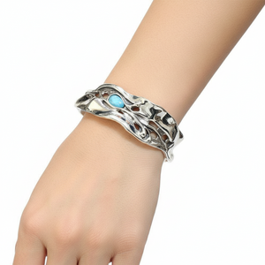 Astonishingly attractive designer bangle hand crafted from sterling silver with a lovely turquoise gemstone with intricately crafted organic work.