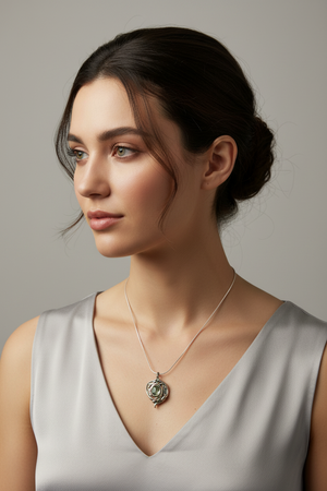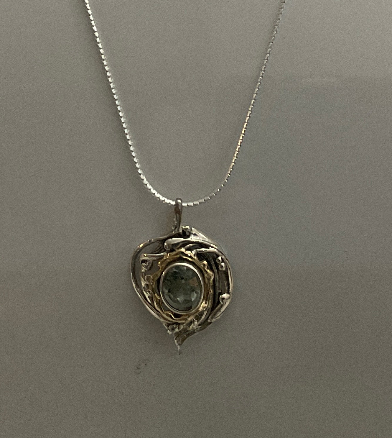 This is a delightful sterling silver and 14 carat gold pendant, which is hand made by Hagit Gorali and set with a round brilliant cut,green amethyst gemstone, set in a rub-over setting. The pendant has an eye-catching, contemporary design, with organic flowing lines.
