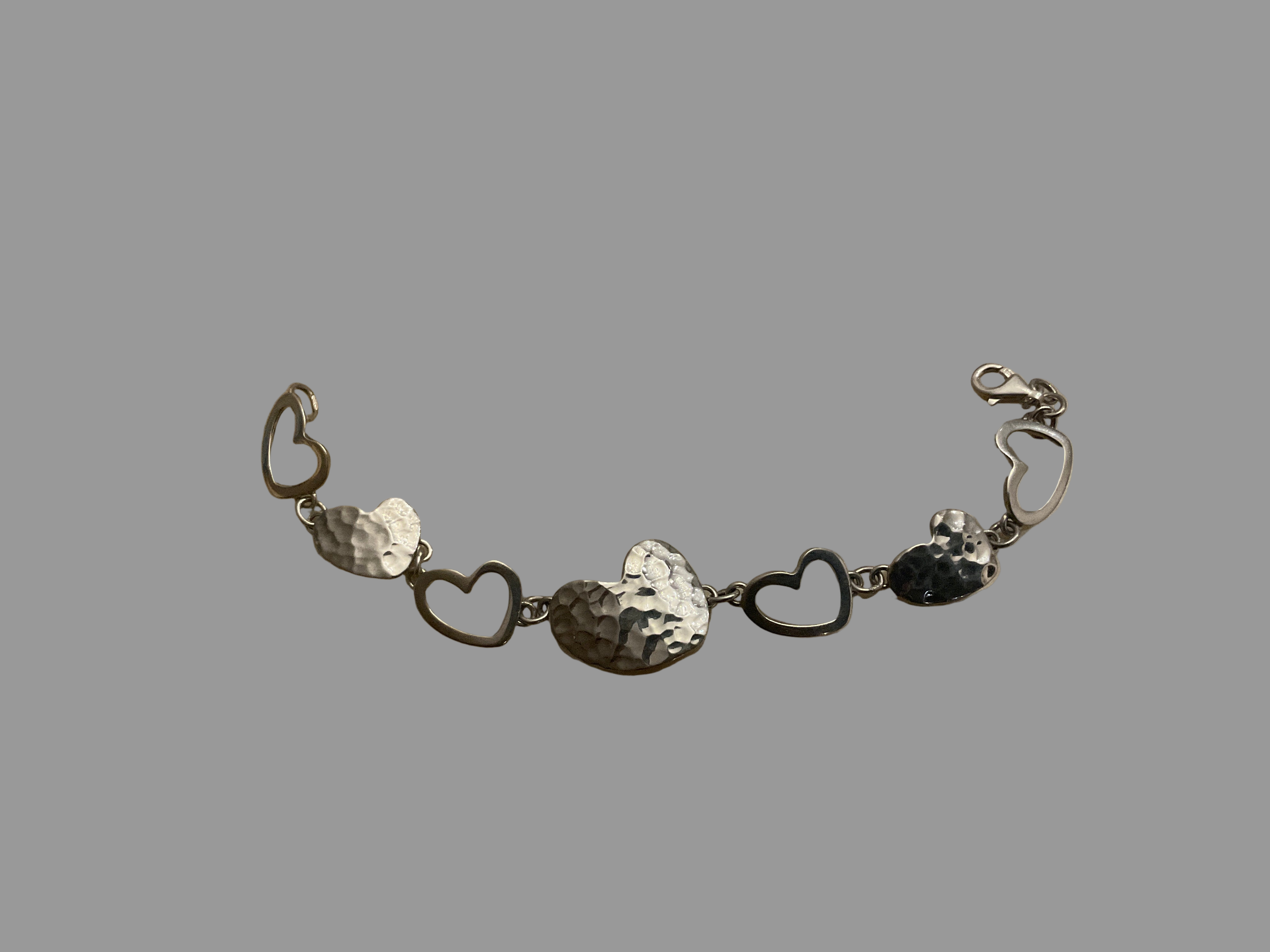 • This lovely bracelet is handcrafted from highly polished and hammered sterling silver and made by the designer Annabel. The piece is made of sterling silver hearts… The bracelet is handcrafted with sterling silver by designer Annabel and features hammered hearts. Made with high-quality materials, it's both durable and stylish, perfect for completing any outfit.