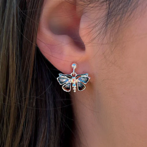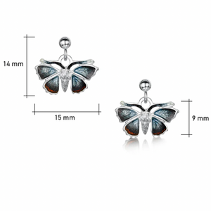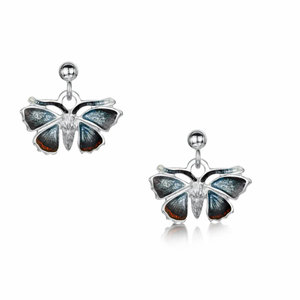 A pair of stylish drop red admiral butterfly sterling silver and enamel drop earrings. Beautiful designer earrings handcrafted in Orkney and inspired by the butterflies seen from Sheila Fleet's workshop.