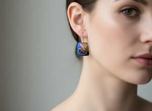A beautiful pair of titanium drop earrings, anodised to bring out striking colours, fitted on silver hooks and finished with a swirling silver pattern on the front. Constructed from high-quality materials, these earrings offer both durability and style. The anodized titanium creates a stunning array of colors, while the silver hooks and swirling pattern add a touch of sophistication. Perfect for any occasion, these earrings are sure to turn heads.