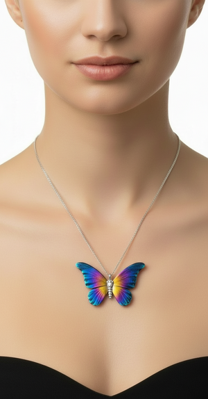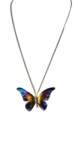 Gorgeous pendant with fabulous colours shot through the titanium. Crafted with elegance and style in mind, this butterfly necklace showcases the stunning beauty of titanium. With its vibrant colors and luxurious shine, it's a must-have accessory for any fashion-forward woman.
