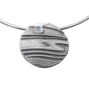 This gorgeous pendant is hand crafted in sterling silver in Orkney by Celina Rupp Jewellery. The inspiration for this design came from the moonlight shining down on the sea to create a shimmer effect on the ripples of the tide, the piece is finished off with a gorgeous moonstone to represent the moon above.