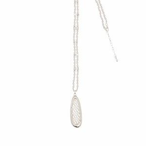 • A beautiful long silver coloured necklace with faux very light grey and silver beads from our fashion jewellery section. Set off with a double carved long kriss crossed pendant  .Affordable and stunning on top of a dress or sweater. Note the beads aren’t black but silvery..
