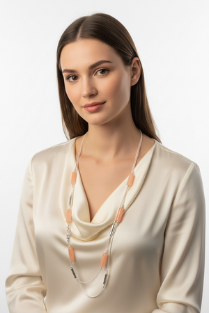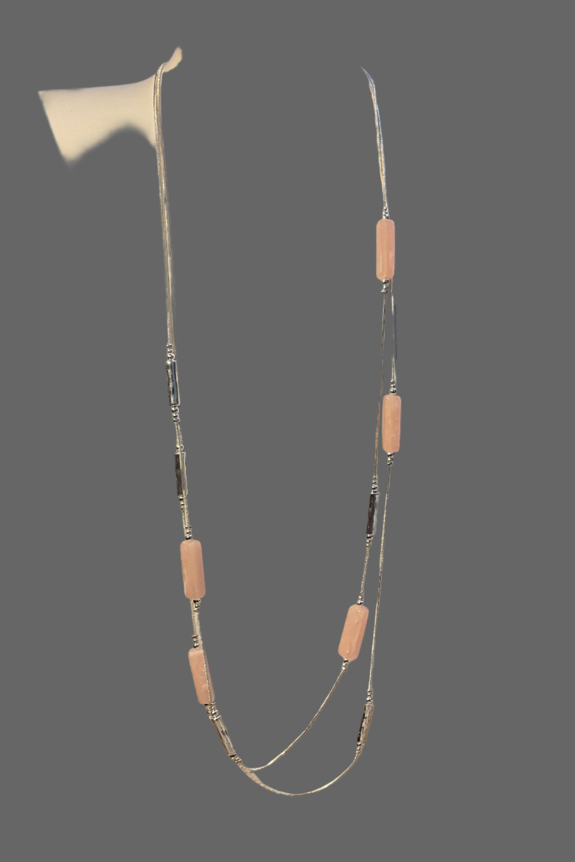 A stunning long silver coloured chain necklace with long pink resin rectangles and silver beads from our fashion jewellery section. Set off with a double row necklace .Affordable and stunning on top of a dress or sweater.