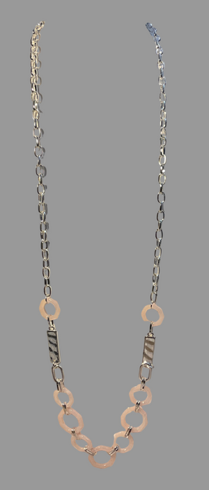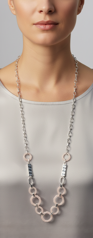 A stunning long silver coloured chain necklace with pink resin hexagonal and silver chain from our fashion jewellery section .Affordable and stunning on top of a dress or sweater.