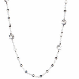 A stunning long silver coloured chain necklace with crystal beads andsilver coloured roundels .