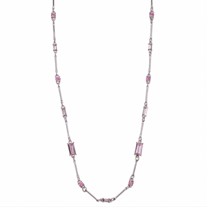• A stunning long fine silver coloured  chain set with pink long and round crystals from our fashion jewellery section .Affordable and stunning on top of a dress or sweater.