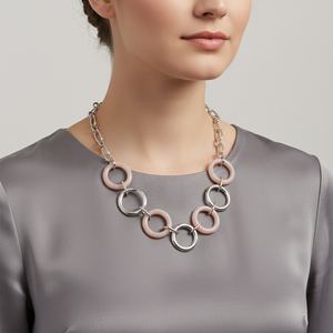 • A stunning silver coloured multi chain and pink resin circles from our fashion jewellery section .Affordable and stunning on top of a dress or sweater.