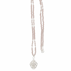 • A beautiful long silver coloured necklace with rose coloured beads and silver beads from our fashion jewellery section. Set off with a diamond shaped pendant. Affordable and stunning on top of a dress or sweater.