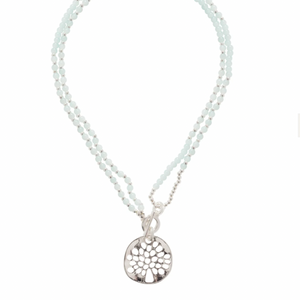 A captivating silver coloured necklace from our fashion jewellery collection. The necklace has a greenish aqua and silver coloured beads and a silver coloured abstract tree of life set with a T Bar hanging from the chains.