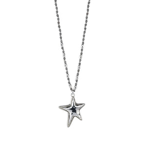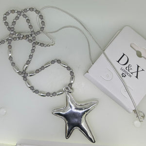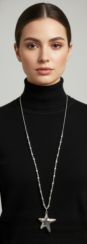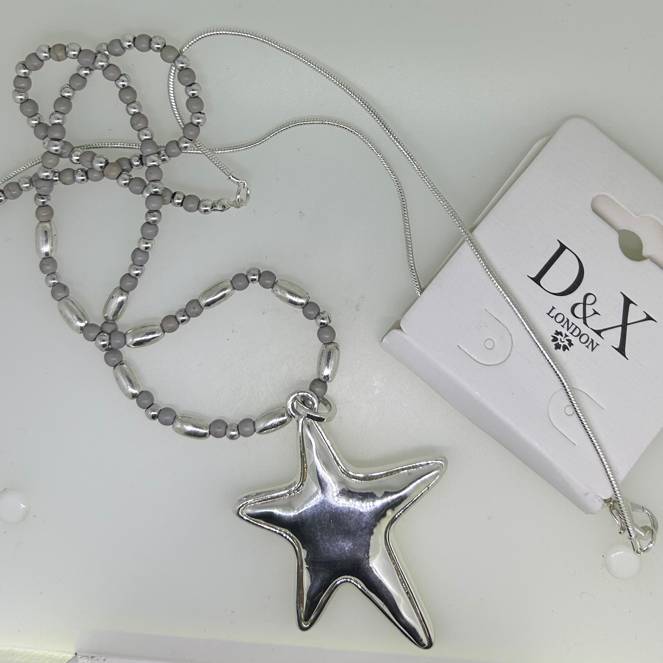A lovely silver coloured necklace from our fashion jewellery section. This is a gorgeous beaded, shiny silver coloured star on a long silver coloured chain.