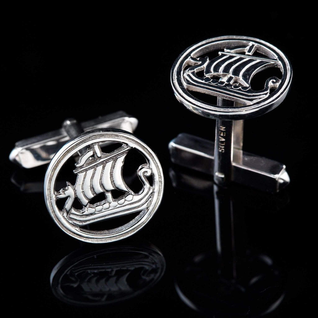 These exceptional cufflinks draw inspiration from the Nordic maritime heritage, showcasing an intricately detailed Viking longship design. Handcrafted by skilled Shetland artisans, each pair is meticulously fashioned from either highly polished sterling silver or 9ct yellow gold, ensuring lasting brilliance and durability. The longship motif captures the essence of Viking seafaring tradition, making these cufflinks a sophisticated choice for those who appreciate historical craftsmanship and meaningful design. Whether worn for formal occasions or as a statement of cultural appreciation, these pieces combine authentic heritage with refined elegance. The superior quality of materials and expert finishing guarantee they'll become treasured accessories in any discerning wardrobe.