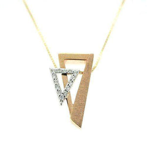 A superb 14 carat textured and polished white and rose gold designer pendant set with 0.10 carats of round brilliant cut diamonds. This pendant has an art deco design and comes with a 16 inch gold chain.