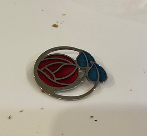 • This is a stunning brooch, made from rhodium plated copper and enamel and handmade in Cornwall, England. This brooch has an intricate rose design inspired by the window designs of Charles Rennie Mackintosh. The roses are finished with pink enamel and the background of the brooch is in purple enamel.