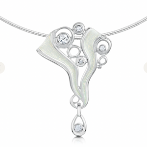 This beautiful piece is part of Sheila Fleet's Arctic Stream collection, which is inspired by the shapes and colours of rocks, glaciers and water. A beautiful pendant made with blue and white enamel down the middle in two sections, with a few blue enamel bubbles and a few open bubbles, as one single blue drop hangs from the pendant.